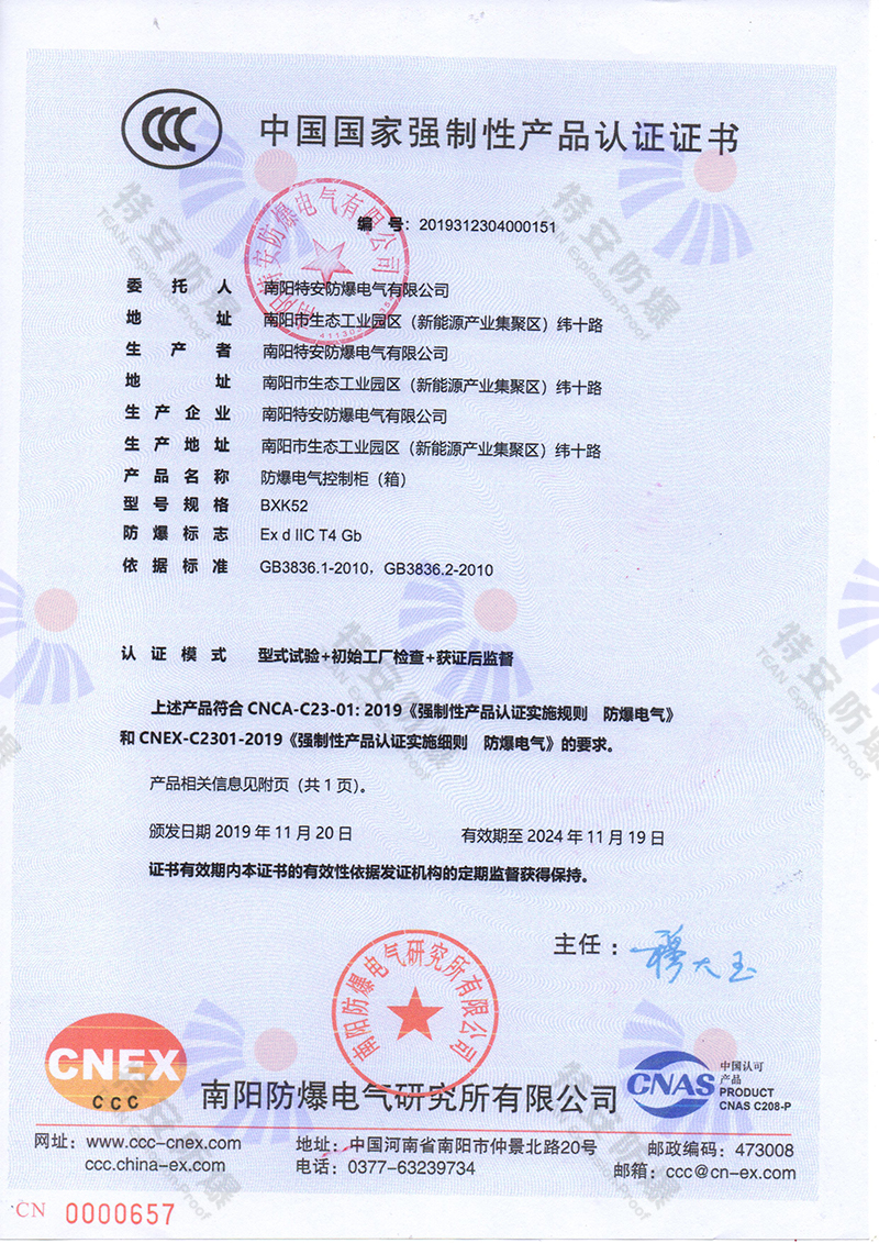 防爆電氣控制箱IIB 中國國家強制性認證證書(shū)(3C證書(shū))