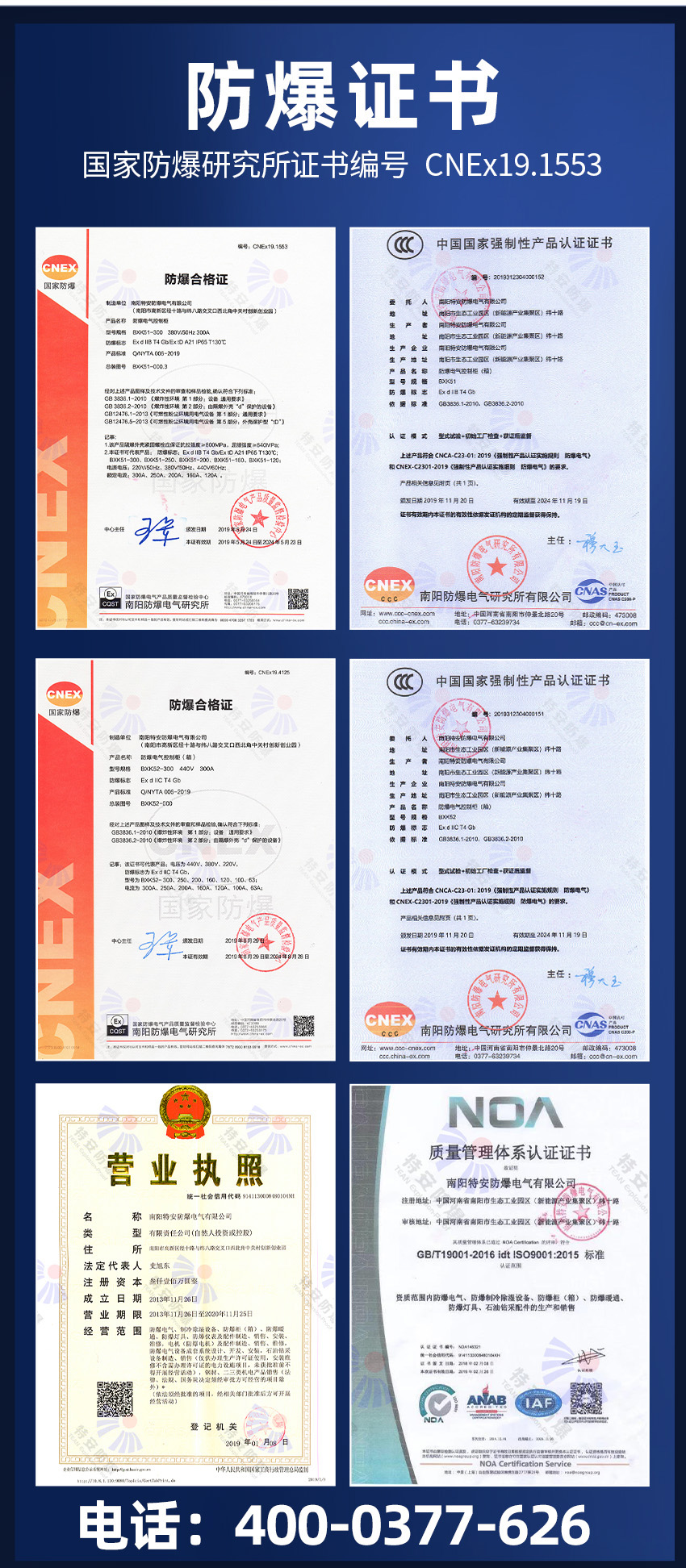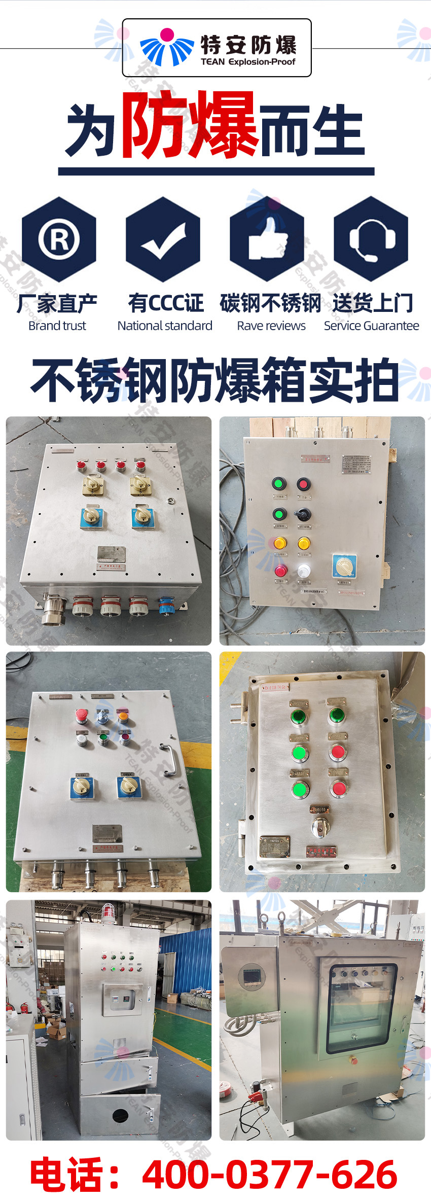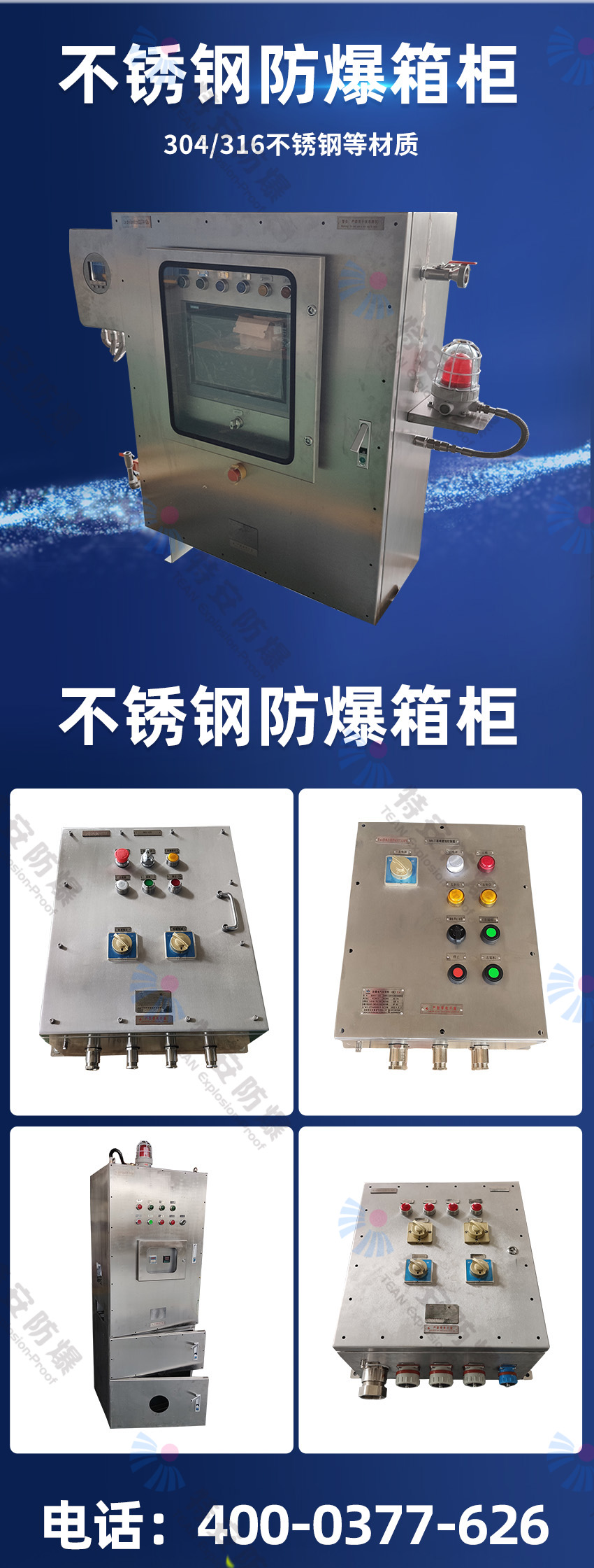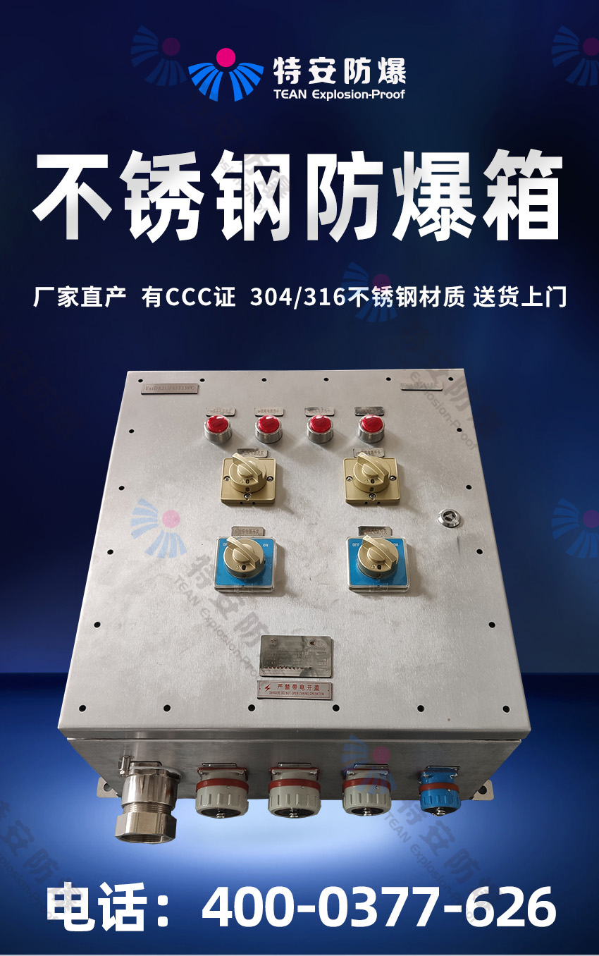 特安防爆專(zhuān)業(yè)生產(chǎn):防爆配電箱,防爆控制箱,防爆電控箱,防爆接線(xiàn)箱,防爆配電柜,防爆電氣控制箱,防爆電氣控制柜等各種防爆箱柜。我們擁有防爆研究所頒發(fā)的CNEX合格證,證書(shū)編號為CNEX19.4124